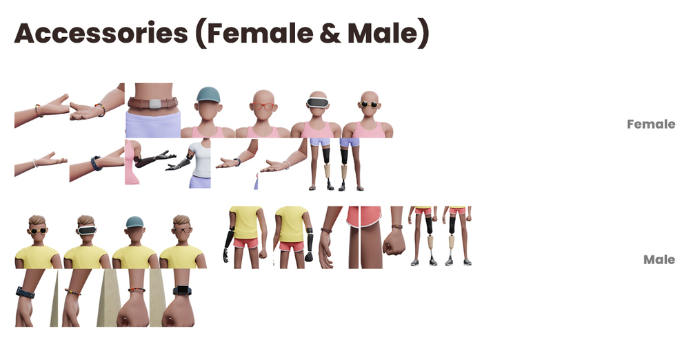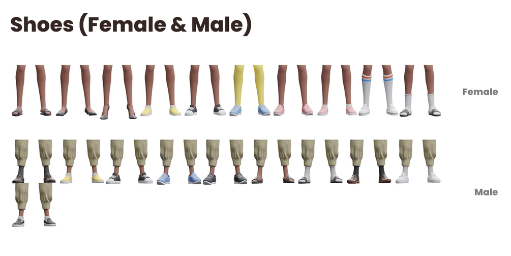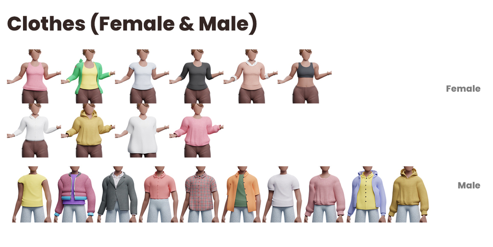 - 10 top clothes, 10 pants, 10 shoes, 10 hairstyles, 10 accessories for female & Male