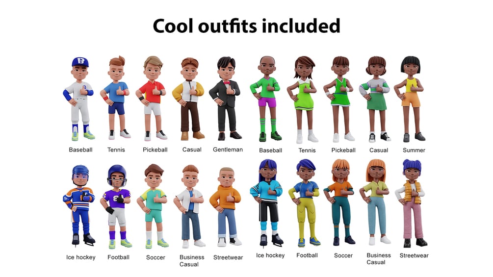 ✅ 20 outfits (10 for males, 10 for females)